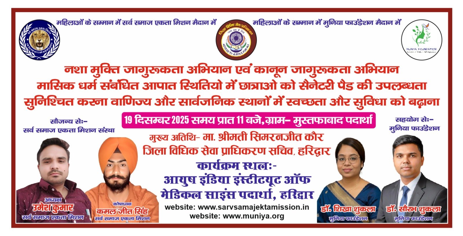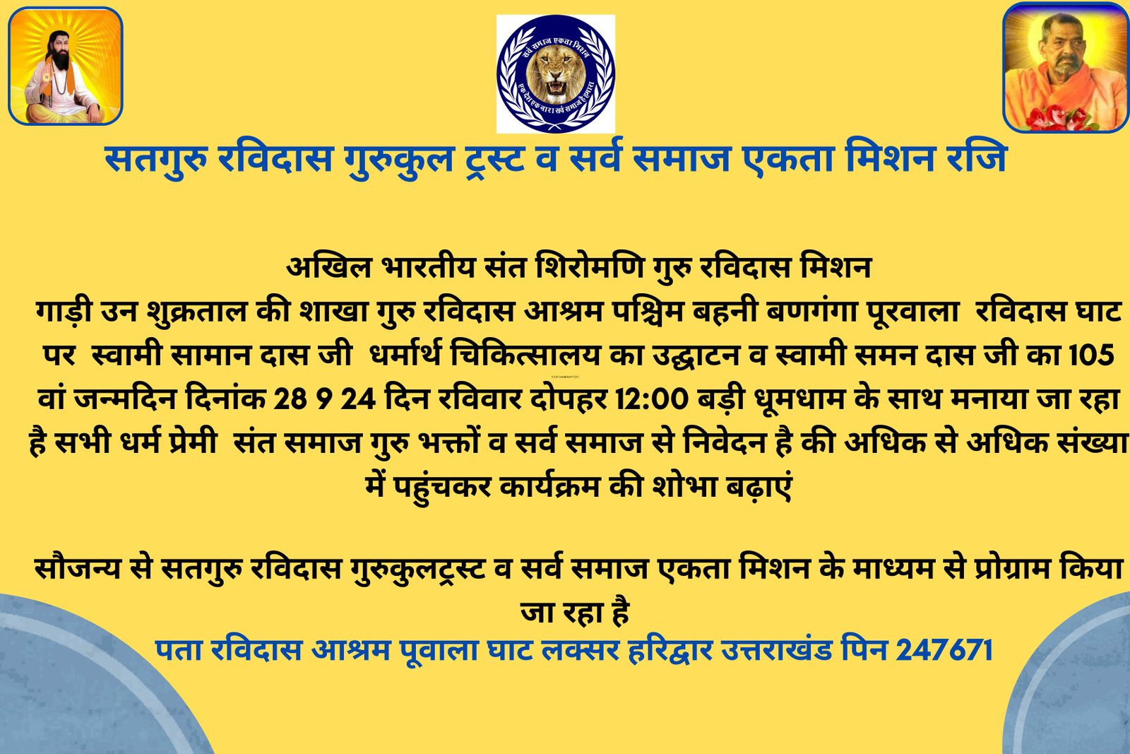 हमें आपको यह सूचित करते हुए अत्यंत हर्ष हो रहा है कि सर्व समाज एकता मिशन के सौजन्य से समाज कल्याण एवं स्वास्थ्य जागरूकता के पावन उद्देश्य हेतु एक विशेष कार्यक्रम का आयोजन किया जा रहा है।